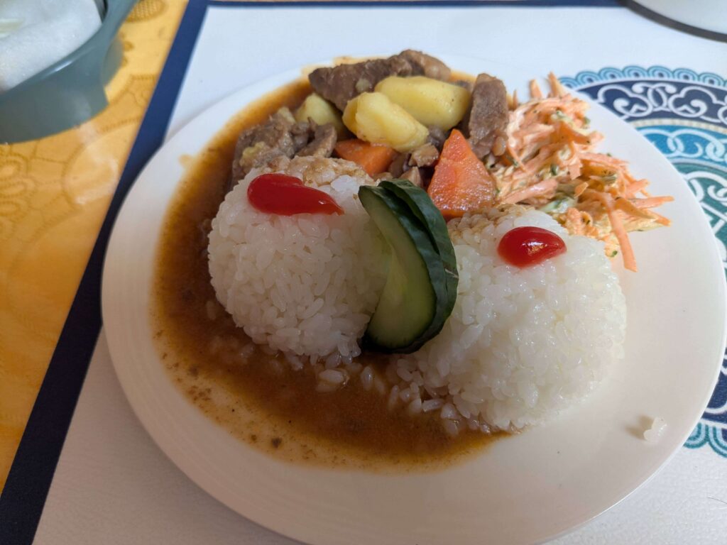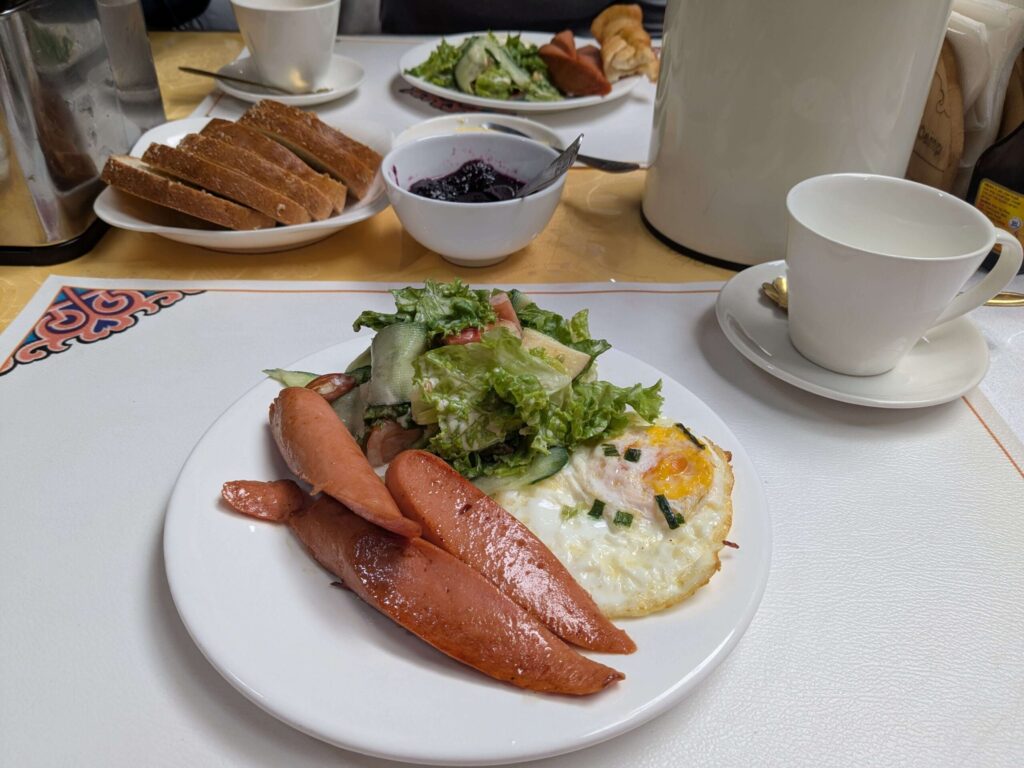 食事は日本人も食べやすいようにアレンジはされているものの、基本的にマトンなのでマトンが苦手な私は結構頑張って食べました。写真のソーセージはビーフでした(朝食)。