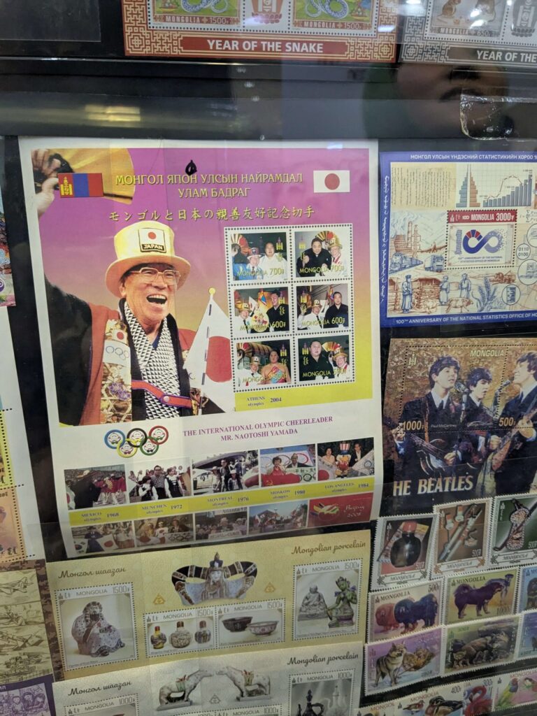 買わなかったけど有名なオリンピックおじさんとモンゴル人関取のコラボ切手(?)もありました。