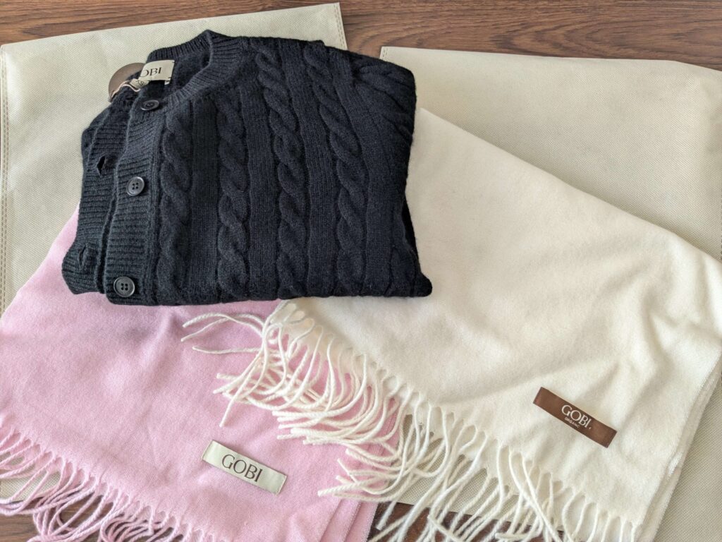 スカーフ168,000₮(約6900円)。セーター₮448,000(約18399円)。